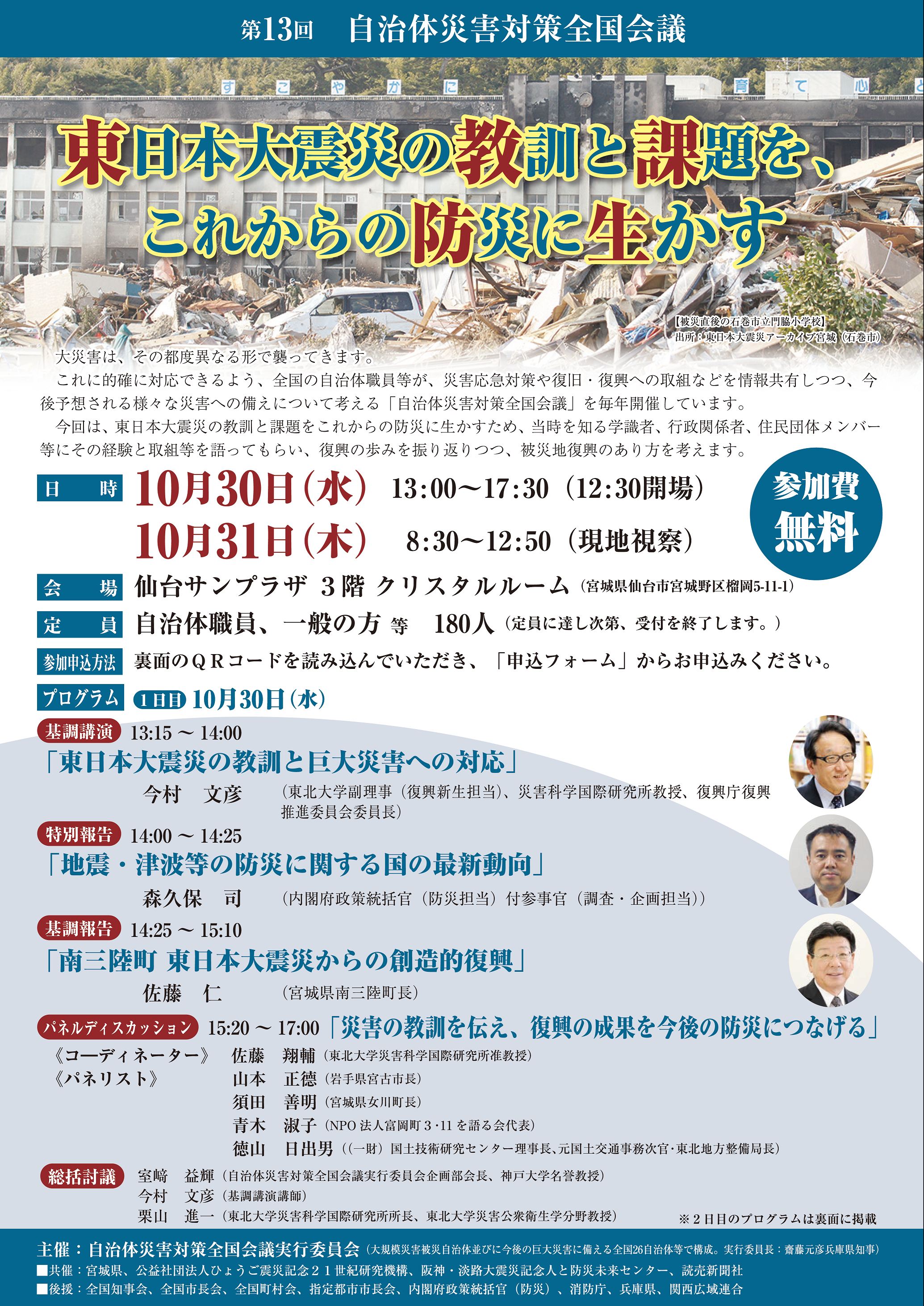 お知らせ 詳細これまでの災害対策や復旧・復興への取組を踏まえ、今後予想される災害への備えについて考える「自治体災害対策全国会議」が、東北で初、宮城県を会場に開催されます。ぜひご参加ください。 日時:10月30日(水曜日)午後1時~午後5時30分 10月31日(木曜日)午前8時30分~午後0時50分(現地視察) 場所:仙台サンプラザ 3階クリスタルルーム(仙台市宮城野区榴岡5-11-1) テーマ:「東日本大震災の教訓と課題を、これからの防災に生かす」 内容:1日目:基調講演、基調報告、パネルディスカッション等 2日目:現地視察(みやぎ東日本大震災津波伝承館、石巻市震災遺構門脇小学校) 定員:180名(定員になり次第締め切りとなります。) 参加費:無料 問い合わせ先:自治体災害対策全国会議実行委員会事務局 TEL:078-262-5713 『防災推進課』HP ≫https://www.pref.miyagi.jp/soshiki/bousai/jichitaisaigaitaisakukaigi.html